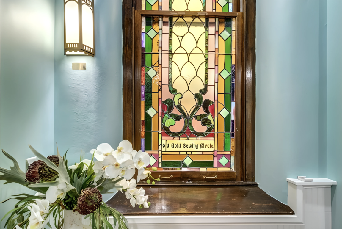 Once a place of quiet gathering, the chapel now offers a fresh, elevated space filled with character, including original stained glass windows, high ceilings, and soft, natural light that adds warmth and romance to your day.
